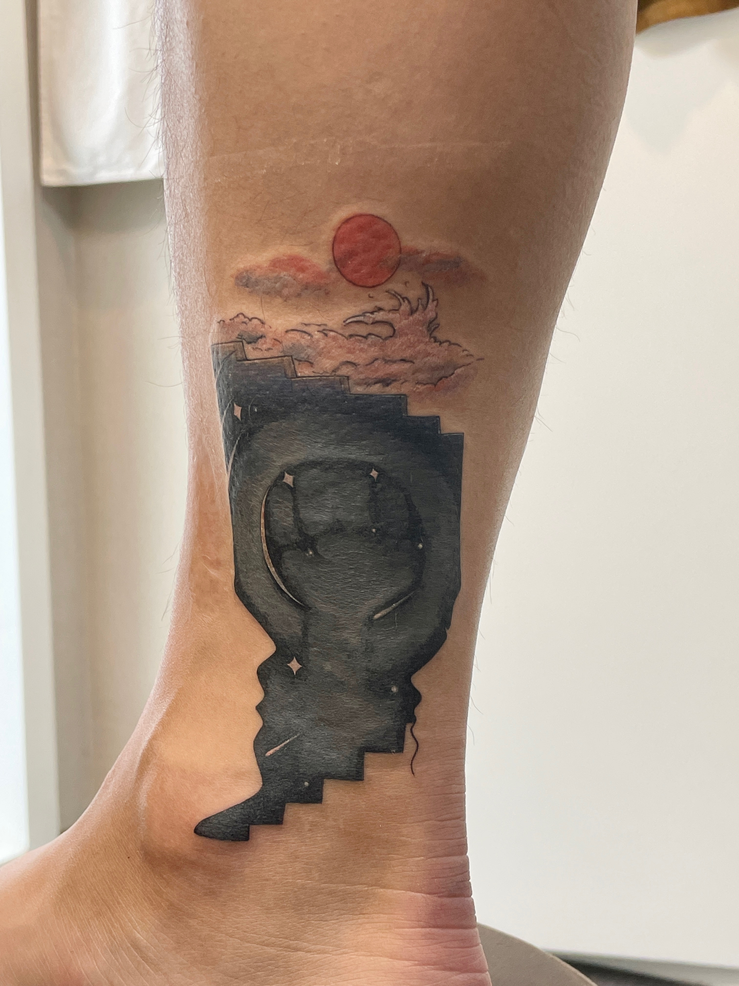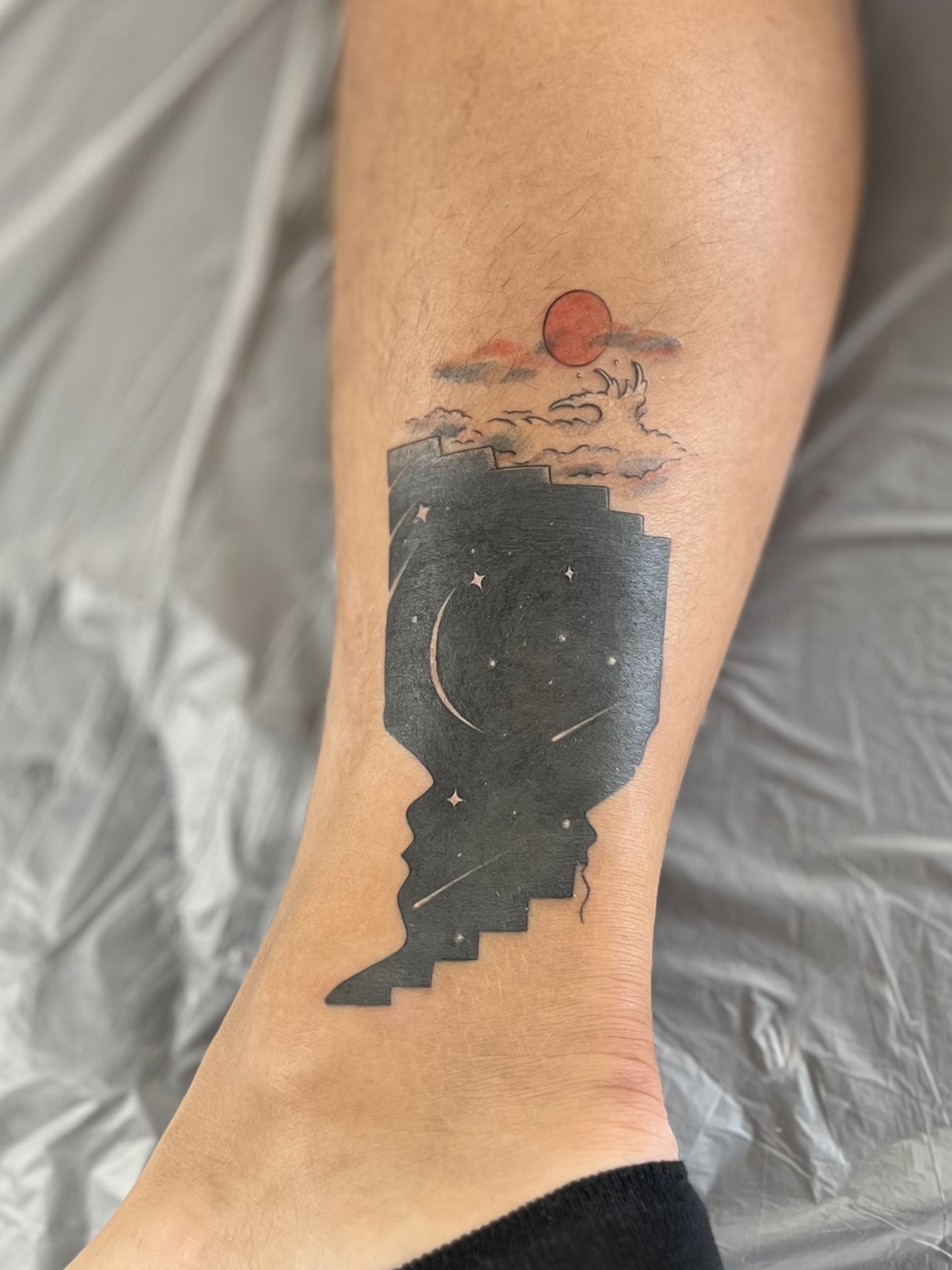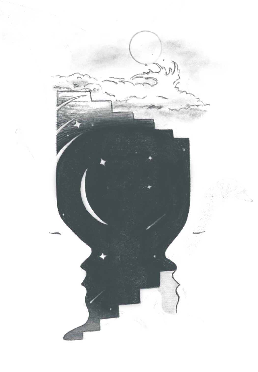 전체적인 크기는 실선으로 표시했고, 어둠영역은 빗금처리 하였습니다. 가정이 있으시다고 하여 도안에 담은 의미는 ‘서로 다른 두 존재의 조화를 통해 성장과 깨달음을 얻을 수 있음’을 표현해 보았어요. 기존에 가지고 있던 심볼의 의미를 확장하여 남,녀의 옆모습 라인 드로잉을 넣었고 어둠 부분이 너무 어두워보이지 않게 하기 위한 장치로 밤의 느낌을 낼 수 있는 달, 별똥별, 별 개체를 사이에 배치하였으며 어둠 주변은 계단 형태로 마무리지어 성장의 의미와 연결시켜 보았습니다. 도안 제일 위쪽으로는 원하셨던 파도를 구름과 엮어 밤과 상반되는 이미지인 낮으로 표현해 보았습니다.